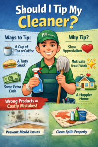 Do i tip house cleaners at Ph Cleaner? A tip makes happy cleaners. We make happier homes. Your gesture doesn’t need to be cash. Tea or a kind word matters just as much.